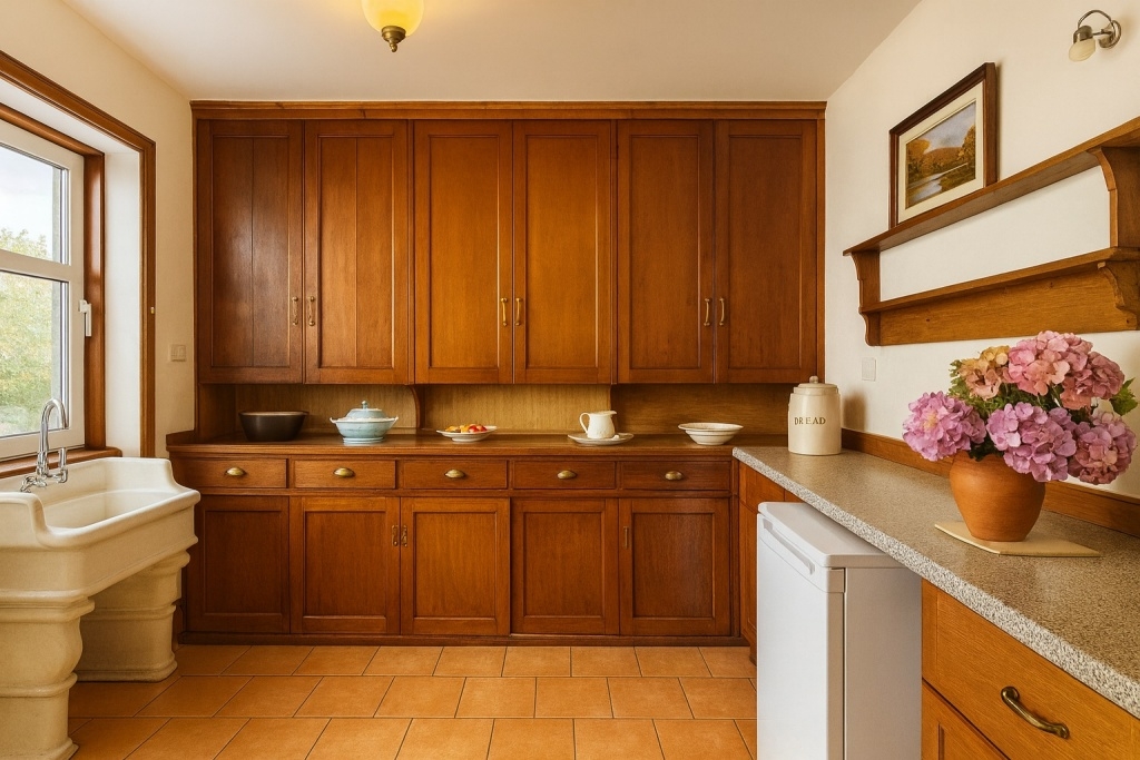 Large open space with some traditional built-in cupboards with shelving above and wood worktops . Some modern style base units with matching wall units and contrasting worktops. Tradition basin with mixer taps . Ceramic hob, fixed shelving and mug rack. Double oven at eye level. Free standing Range cooker , American style fridge freezer. Fitted base units with matching worktops to the back with stainless steel sink with mixer taps, space below for white goods . Window above the sink .